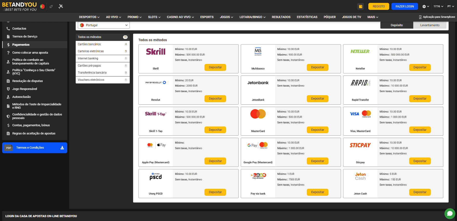 Os jogadores de Portugal tĂȘm flexibilidade e segurança ao fazer depĂłsitos, com um depĂłsito mĂnimo de apenas 10 EUR! Tanto opçÔes de pagamento modernas quanto tradicionais estĂŁo disponĂveis para garantir transaçÔes rĂĄpidas e fĂĄceis. Confira os principais mĂ©todos de pagamento na tabela abaixo: